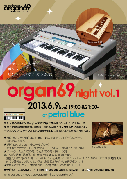 ³«¾ì 18:00 ³«±é 19:00¡Á¡¡¡¢21¡§00¡Á¡Ê2¥¹¥Æ¡¼¥¸¡Ë ¥ª¥ë¥¬¥ó±éÁÕ¡§ ¿ÜÆ£¿®°ìϺ DJ¡§¿¿ÅçÌÔ Í½Ìó 1000yen¡¡/ ÅöÆü 1300yen ¡Ê¶¦¤Ë¥É¥ê¥ó¥¯ÊÌ¡Ë Ê¡²¬Âç¶¶¤Î¥ª¥ë¥¬¥ó²°organ69 ( http://organ69.net/index.shtml) ¤¬¤ªÆÏ¤±¤¹¤ë¥¹¥Ú¥·¥ã¥ë¥¤¥Ù¥ó¥ÈÂè°ìÃÆ¡ª Åìµþ¤Ç³èÌöÃæ¤Î¸°È×ÁÕ¼Ô¡¢¿ÜÆ£¿®°ìϺ»á¤ò·Þ¤¨¤Æ¥³¥ó¥Ü¥ª¥ë¥¬¥ó±éÁÕ£²¥¹¥Æ¡¼¥¸¡£ ¥ì¥¢¤Ê¥Ó¥ó¥Æ¡¼¥¸¥ª¥ë¥¬¥ó±éÁÕ¤òBGM¤ËÈþÌ£¤·¤¤¤ª¼ò¤ò°û¤ß¤Þ¤»¤ó¤«¡£ ¡ú¡ú¥ª¥ë¥¬¥ó±éÁÕ¡§¿ÜÆ£¿®°ìϺ http://sound.jp/sudo-man/ ¡ú»ÈÍÑͽÄꥪ¥ë¥¬¥ó:Farfisa Mini Compact¡¡/¡¡Bontempi P