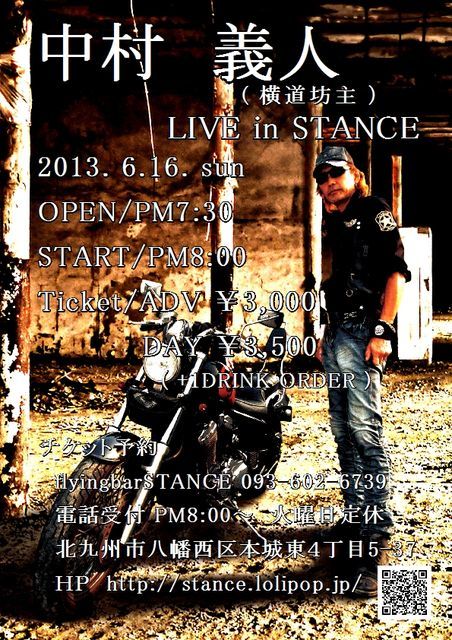 ´ÉÍý¿ÍÍÍ¡¢¹ðÃΤª´ê¤¤¤·¤Þ¤¹¡£ ¡ÖÃæÂ¼µÁ¿Í(²£Æ»Ë·¼ç¡Ë LIVE in STANCE¡× 6·î16Æü(Æü) OPEN 19:30/ START 20:00 Á°Çä ¡ï3000+£±DRINKÊÌ / ÅöÆü ¡ï3500+£±DRINKÊÌ ¥Á¥±¥Ã¥ÈÌä¹ç¤»/flyingbar STANCE TEL:0936026739¡¡Ê¡²¬¸©Ë̶彣»ÔȬȨÀ¾¶èËܾëÅì4ÃúÌÜ5-37 ¥Á¥±¥Ã¥È¤ÏÅÅÏÃͽÌó¤Î¤ß¡¢40¿Í¸ÂÄê PM8»þ¤«¤é¥ª¡¼¥×¥ó¡£Ëè½µ²ÐÍËÄêµÙÆü flyingbarSTANCE http://stance.lolipop.jp/ ÉÔŬÀڤǤ·¤¿¤éºï½ü¤è¤í¤·¤¯¤ª´ê¤¤¤·¤Þ¤¹¡£