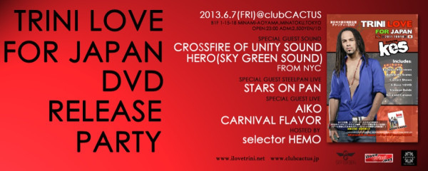 2011年のKES来日時の模様を収めたDVD「東日本大震災復興支援チャリティーアルバム TRINI LOVE FOR JAPAN TOUR 2011 TOKYO featuring KES」のDVD発売を記念して、ご覧のような豪華なアーティストを迎えてのRELEASE PARTYです!(注:KESは今回の6/7のPARTYには来日致しません。DVDのジャケットをそのままフライヤーに使用しております!ご了承下さい。)DVDはもちろんこの日カクタスでもご購入できます。この日DVDをご購入してくださった方への特典でI LOVE