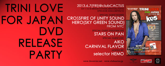 2011年のKES来日時の模様を収めたDVD「東日本大震災復興支援チャリティーアルバム TRINI LOVE FOR JAPAN TOUR 2011 TOKYO featuring KES」のDVD発売を記念して、ご覧のような豪華なアーティストを迎えてのRELEASE PARTYです!(注:KESは今回の6/7のPARTYには来日致しません。DVDのジャケットをそのままフライヤーに使用しております!ご了承下さい。)DVDはもちろんこの日カクタスでもご購入できます。この日DVDをご購入してくださった方への特典でI LOVE