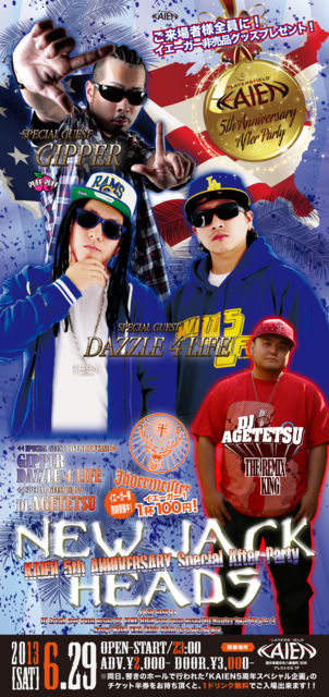 KAIEN5周年記念スペシャル企画アフターパーティ! 響きのホールだけじゃ『6/29KAIEN5周年企画』は終りません! KAIENを代表するレギュラーイベント《NEW JACK HEADS》がアフターをプロデュース! NORAの筆頭MCである《GIPPER》、三重神の国から《DAZZLE 4 LIFE》、多数の有名アーティストのバックDJもこなすミラクルDJ《DJ AGETETSU》という3組のビッグゲストを招きKAIENにボムを投下する! 福井からは、NEW JACK HEADSレギュラーメンバーに加え、 KAIENを拠点に活動する福井発信レーベルTOP PRIZE MUSICフルメンバーとKAIENに縁の深いア