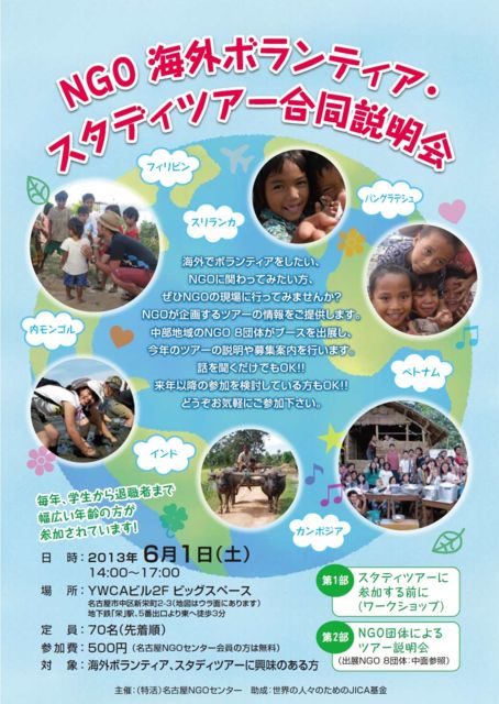 以下、転送歓迎!! ■----------------------------------------------------------■ ★☆ 参 加 者 募 集 ☆★ NGO 海外ボランティア・スタディツアー合同説明会 2013年6月1日(土)@YWCAビル 2Fビッグスペース ■----------------------------------------------------------■ 海外でボランティアをしたい、NGOに関わってみたい方、ぜひ NGOの現場に行ってみませんか?中部地域のNGO8団体がブース 出展し、今年のツアーの説明や募集案内を行います。 話を聞くだけでもOK!!来年以降の参加を検討して
