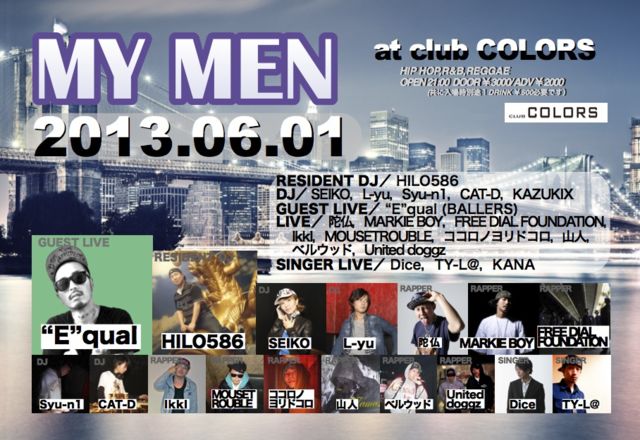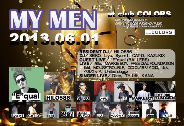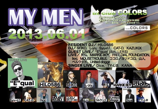 ■6月1日(土) MY MEN vol.147 @COLORS HIP HOP,R&B,REGGAE OPEN 21:00/DOOR ¥3000/ADV ¥2000(共に入場時別途1DRINK ¥500必要です) 【RESIDENT DJ】 HILO586 【DJ】 SEIKO,L-yu,Syu-n1,CAT-D,KAZUKIX 【GUEST LIVE】 “E”qual (BALLERS) 【LIVE】 陀仏,MARKIE BOY,FREE DIAL FOUNDATION,IkkI(from SHIGA),MOUSETROUBLE,ココロノヨリドコロ,山人,ベルウッド,United doggz 【SINGER LIVE】 Dice,TYーL@,KANA @CLUB COLORS(名古屋市中区栄4丁目7番17号ユタカビル3F) ◆毎月第一土曜日は
