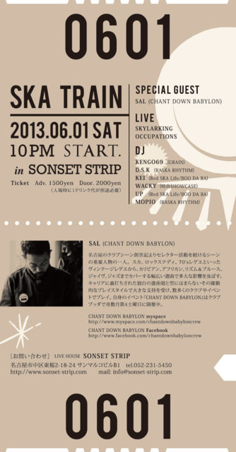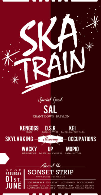 SKA TRAIN 2013.06.01 Good Saturday!! 10PM〜START. @新栄SONSET STRIP ADV¥1,500/DOOR¥2,000 (入場時1ドリンク別途必要) ――――――――――――――――――――――――――――― SPECIAL GUEST: SAL(CHANT DOWN BABYLON) BAND: SKYLARKING OCCUPATIONS DJ: KENGO69 (GRAIN) / D.S.K (RASKA RHYTHM) / KEI (Red SKA Life/BOO DA BA) WACKY (時鳥SHOWCASE) / UP (Red SKA Life/BOO DA BA)/ MOPIO (RASKA RHYTHM) ――――――――――――――――――――――――――――― 前売り券ご予約