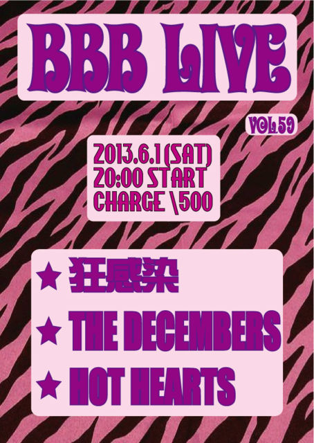 BBB LIVE 59 2013.6.1 (SAT) 20:00 START CHARGE \500 ☆ 狂感染 ☆ THE DECEMBERS ☆ HOT HEARTS