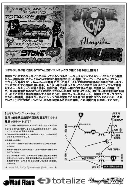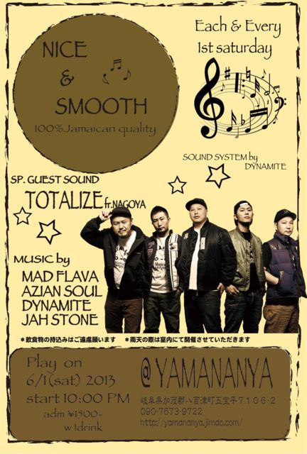 NICE & SMOOTH¡¡ 100% Jamaican quality Ìî³°¥¹¥Ú¥·¥ã¥ë¡ª SP. guest sound TOTALIZE fr.NAGOYA music by MAD FLAVA AZIAN SOUL DYNAMITE JAH STONE ¡¡ sound system by DYNAMITE ADM \1500with 1drink 6/1¡ÊÅÚ¡ËPM 10:00~ ¡÷¡Ø»³¤Ê¤ó¤ä¡Ù ´ôÉ츩²ÃÌз´È¬É´ÄÅĮȬɴÄÅ£·£±£°£¶¡Ý£² £°£µ£·£´¡Ý£´£³¡Ý£²£·£¹£· ¡ö°û¿©Êª¤Î»ý¤Á¹þ¤ß¤Ï¤´±óθ´ê¤¤¤Þ¤¹¡£ ¡ö±«Å·¤ÎºÝ¤Ï¼¼Æâ¤Ë¤Æ³«ºÅ¤µ¤»¤Æ¤¤¤¿¤À¤¤Þ¤¹¡£ º£²ó¤ÎNICE & SMOOTH¤ÏÁ°²ó¤Ë°ú¤Â³¤Ìî³°¥¹¥Ú¥·¥ã¥ë¡ªËܾ쥸¥ã¡¼¥¯¥Á¥¥ó¤ËDYNAMITE¤Î¶Ë¾å¥µ¥¦¥ó¥É¥·¥¹¥Æ¥à¡ª
