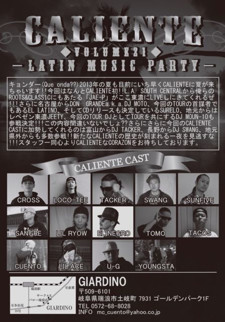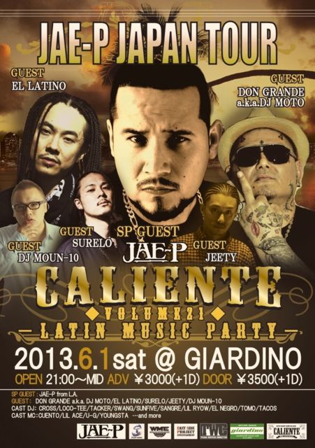 ¼¡²óCALIENTE¤Ï°ì½µ¤º¤é¤·¤Æ£¶·î£±Æü¤Ë³«ºÅ¤·¤Þ¤¹¡ª º£²ó¤â¤È¤ó¤Ç¤â¤Ê¤¤ÆâÍÆ¤Ç¤ªÆÏ¤±¡ª¡ª JAE-P¡¡JAPAN¡¡TOUR CALIENTE VOL.21 ¡ÁLATIN MUSIC PARTY¡Á 2013.6.1.¡ÊSAT¡Ë OPEN 21:00¡ÁMID @GIARDINO ´ôÉ츩¿ðϲ»ÔÅÚ´ôÄ®7931 ¥´¡¼¥ë¥Ç¥ó¥Ñ¡¼¥¯1F ADV¡¡\3000+1D DOOR \3500+1D SP GUEST JAE-P from L.A. GUEST DON GRANDE a.k.a. DJ MOTO EL LATINO SURELO JEETY DJ MOUN-10 CAST DJ's CROSS LOCO-TEE TACKER SWANG SUNFIVE SANGRE LIL RYOW EL NEGRO TOMO TACOS CAST MC's C