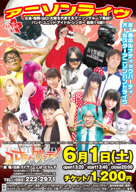 広島初!?アニソン定期デイイベントを6月1日(土)14時よりスタートします! アニソンの他にもゲーム、ボカロやヒップホップのライブなどなど様々なジャンルの音楽を大音量で提供します! 記念すべき第一回は愛媛からDisry&ハイパーのんMCをゲストに迎え、会場を盛り上げます! どうぞよろしくお願いします! ANIBLEND vol.1 開催日 2013年6月1日(土) 場所 @Bash On Bong(広島市中区薬研堀6-18マシダビル2F) 時間 OPEN 14:00 / CLOSE 20:00 料金 DOOR \1000+1DRINK ORDER ■GUEST DJ Disry&ハイパーのんMC(ヲタスコ! / 愛の松山エロゲ道