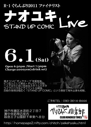 2013年6月1日(土) ぺけひゃく倶楽部は!! R-1ぐらんぷりファイナリスト!! 【ナオユキSTAND UP COMICライブ!!】 みんなで笑おうぜ!! 最強のピン芸人!水道筋に来る!! ご予約受付中です♪ ■2013.6.1(Sat) ナオユキ STAND UP COMIC LIVE ■Open 18:30/Start 19:30 ■Charge:2000yen(ワンドリンク付) ■ご予約:090-3614-8444