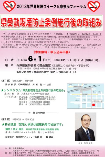 ★ 2013年世界禁煙ウイーク兵庫県民フォーラム ★ 参加無料 申込不要 ・日時 2013年6月1日土曜日 13:30〜15:30 ・場所 兵庫県医師会館6階会議室 (神戸・三宮 南へ徒歩7分) ・シンポジウム 「県受動喫煙防止条例施行後の取組み」 ・特別講演 「禁煙と検診は健康長寿の否決です」 講師 金子昌弘(東京都予防医学協会 呼吸器科 部長)