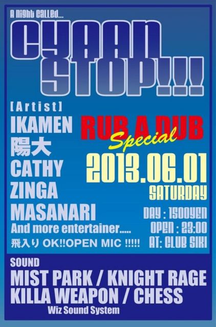 CYAAN STOP!Rub a Dub NIGHT! [DEEJAY] IKAMEN 陽大 CATHY ZINGA MASANARI and more entertainer 飛び入りOK!OPEN MIC! [sound] MIST PARK KNIGHT RAGE KILLA WEAPON wiz s/s CHESS open 23:00~ day only 1500 @clubSIKI