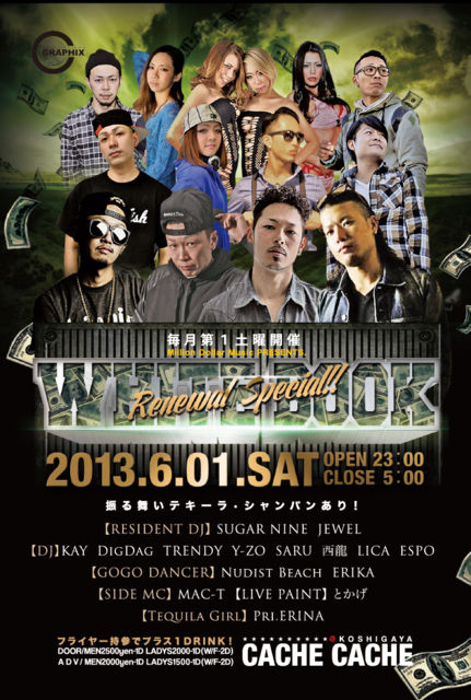¡ÁMillion Dollar Music PRESENTS.¡Á WHITE BOOK. Renewal Special!! @±ÛëCACHE CACHE DATE: 2013.6.1.SAT TIME: OPEN 23¡§00¡¡CLOSE 5¡§00 PRICE: DOOR/MEN2500yen-1D LADYS2000-1D(W/F-2D) ADV/ MEN2000yen-1D LADYS1500-1D(W/F-2D) GENRE: Hip Hop/R¡õB/TOP40/Reggae/etc... ¡ÚRESIDENT DJ¡Û SUGAR NINE JEWEL ¡ÚDJ¡Û DigDag TRENDY Y-ZO SARU À¾Î¶ ESPO LICA ¡ÚGOGO DANCER¡Û Nudist Beach ERIKA ¡ÚSIDE MC¡Û MAC-T ¡ÚLIVE PAINT¡Û ¤È¤«¤² ¡ÚTequila Girl¡Û Pri.ERINA ¡ùRe