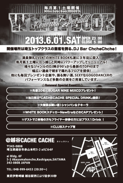 ¡ÁMillion Dollar Music PRESENTS.¡Á WHITE BOOK. Renewal Special!! @±ÛëCACHE CACHE DATE: 2013.6.1.SAT TIME: OPEN 23¡§00¡¡CLOSE 5¡§00 PRICE: DOOR/MEN2500yen-1D LADYS2000-1D(W/F-2D) ADV/ MEN2000yen-1D LADYS1500-1D(W/F-2D) GENRE: Hip Hop/R¡õB/TOP40/Reggae/etc... ¡ÚRESIDENT DJ¡Û SUGAR NINE JEWEL ¡ÚDJ¡Û DigDag TRENDY Y-ZO SARU À¾Î¶ ESPO LICA ¡ÚGOGO DANCER¡Û Nudist Beach ERIKA ¡ÚSIDE MC¡Û MAC-T ¡ÚLIVE PAINT¡Û ¤È¤«¤² ¡ÚTequila Girl¡Û Pri.ERINA ¡ùRenewal Special Event!!!¡ù ¢¨