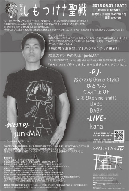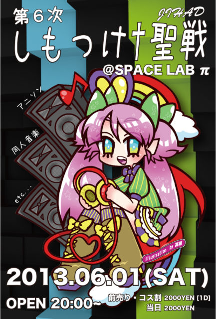 2013.06.01(sat)開催!!! OPEN 20:00〜 @宇都宮 SPACELAB π http://www.spacelab-pi.com/ シーズンで行なっている「しもつけ†聖戦(ジハード)」も今回で6回目に成りました! 1周年も終え、みんなのパワーで栃木を代表するアニクラに成長したと思います。 各地方でチラホラ「しもジハ」の噂も聞くように成りました。 今後も遊びに来てくれた皆に満足して貰えるようなイベントにしていきたいと思いますので応援よろしくお願いします! そして、お待ちかね! 待望の新キャラ「BABY」も今回からしもジハCREWに仲間入り