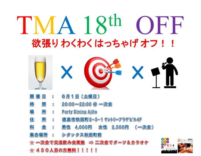 前回オフ会にて述べ参加者442名!!!!!! 今回で第18回目の開催です☆ 今回のオフは6月1日開催、 飲み会・ダーツ・カラオケとイベント盛りだくさんのオフです 初参加者様大歓迎!!途中参加、退出OKです♪ 場所は1次会・2次会共に秋田町での開催になります 楽しい雰囲気と誰もが馴染めるような場を心がけておりますので、 お一人様でも、初参加様でも十分楽しんで頂けます☆ リピート率も非常に高いですよー♪ リピーターさんはもちろん大歓迎お待ちしています☆ 参加したい・気になっている
