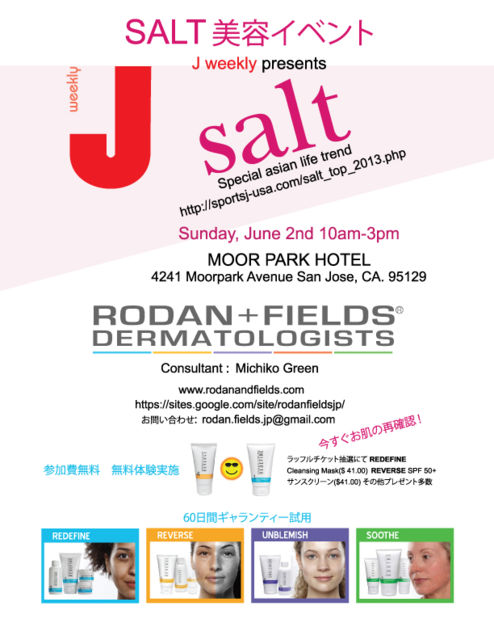 J weeklyが企画するビューティー・フォーラムにて、Rodan+Fields(ロダンアンドフィールズ) アンチエイジングの製品を紹介します。 この製品は全世界に販売されたあのProactiv(プロアクティブ世界65カ国、1000万以上の愛用者を抱えている)を開発した皮膚科医2人(Dr. Katie RodanとDr.Kathy Fields)が新しく立ちあげたブランドです。 皆さんお誘いのうえお立ち寄りください。 場所: 4241 Moorpar Ave San Jose CA 95129 ウエブサイト日本語:https://sites.google.com/site/rodanfieldsjp/ https://www.rod