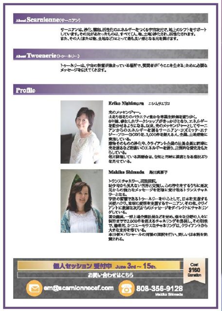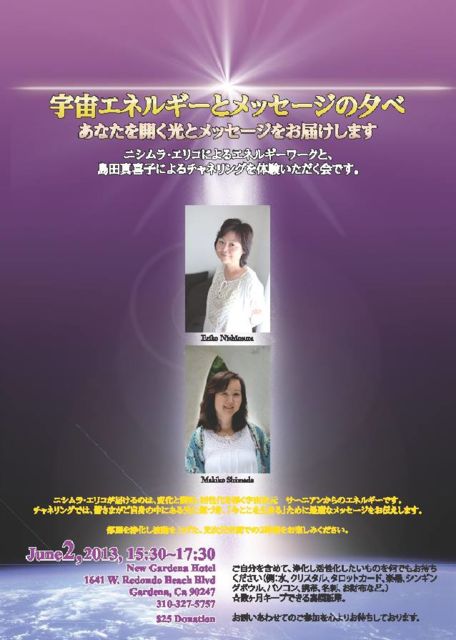 「宇宙エネルギーとメッセージの夕べ」 セミナー開催 6月2日(日)午後3時30分〜5時30分 参加費:$25 予約:ErikoMakikoLA@gmail.com http://scarnionnecef.com/index.php?em-t 浄化と調和、活性化と変化を導くエネルギーである サーニアン・コズミック・エナジー・フロー(SCEF)と、 「今ここを生きる」ヒントをお伝えする島田真喜子のトランス・チャネリングを体験いただく会です。 日本では、「惠里子さん・真喜子さんの会」として、2011年11月 ロサンゼルスの皆さまがご存じの牧野内大史さんと、 牧野内さ