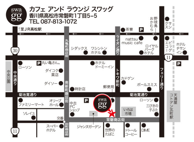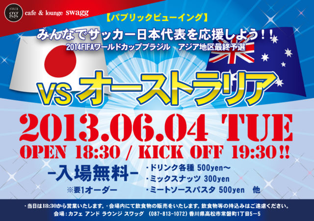 6/4火 FIFAワールドカップ最終予選パブリックビューイング vsオーストラリア戦、プロジェクター&音響設備完備。swaggで臨場感溢れる試合観戦を!入場無料、要1オーダー制です。引き分け以上で2014年W杯出場決定! 2013.06.04 TUE 18:30 OPEN 19:30 KICK OFF!! -入場無料- ※要1オーダー制 ・ドリンク各種 500円〜 ・ミックスナッツ 300円 ・パスタ 500円 他 ・当日は18:30から営業いたします。 ・会場内にて飲食物の販売をいたします。飲食物等の持込みはご遠慮ください。 CAFE & LOUNGE swagg 〒760-0054 香川県高松市常磐町1丁