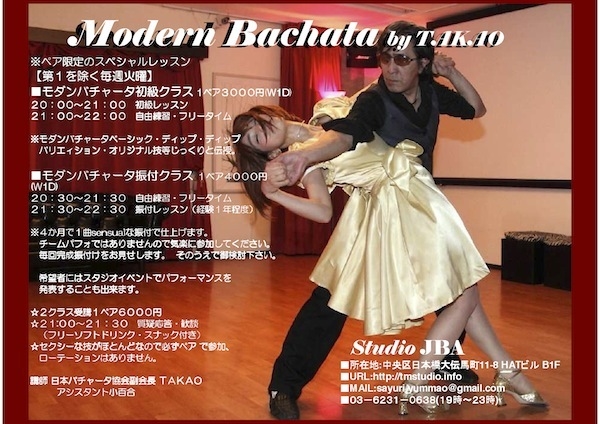 6/11(火) Modern♪Bachata by TAKAO 【毎月、第1を除く、毎週火曜日】 (第1は、カップルナイトです) ★モダンバチャータ振付クラス★ 5月からの振り付けはこちらです。 http://www.youtube.com/watch?v=h-nC83eu7bs&feature=player_embedded ※ペア限定のスペシャルレッスン。 ■モダンバチャータ初級クラス 1ペア3000円(W1d) 20:00〜21:00 初級レッスン 21:00〜22:00 自由練習・フリータイム ※モダンバチャータベーシック・ディップ ディップ バリエィション・オリジナル技等じっくり