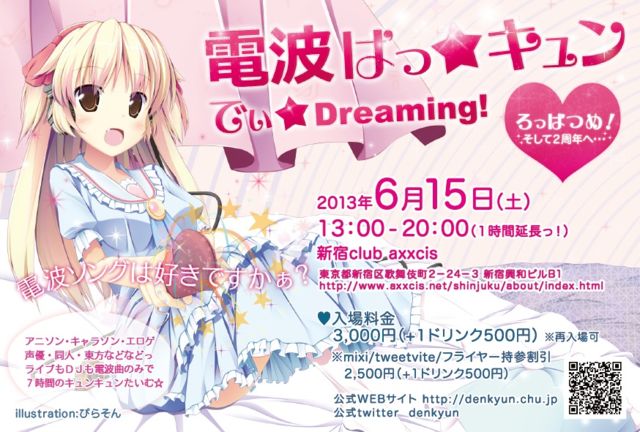 電波はっ☆キュン でぃ☆Dreaming! 〜電波ソングは好きですかぁ?〜 なんと今回、2周年なんですっ! 2周年を迎えた電キュン、 いつもより1時間ぱわーあっぷして頑張っちゃう!! 電波ソング好きなDJと電波なゲストさんによる、 電波ソングクラスタのためのイベント、第6回目です☆ みんなで合いの手楽しい電波っ! 電波といえばあの曲ぅ〜な鉄板曲から 他のイベントではかからないような、マイナー電波…… 埋もれてしまっているあの隠れた良電波…… 一度聞いたら耳から離れない上質