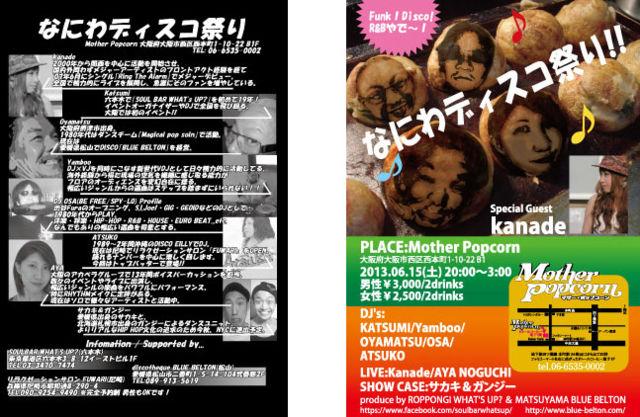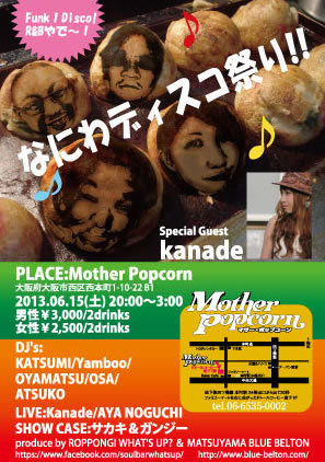 ¡Ú¤Ê¤Ë¤ï¥Ç¥£¥¹¥³º×¤ê¡Û ¢£PLACE Mother Popcorn (http://www.mother-popcorn.com/) Âçºå»ÔÀ¾¶èÀ¾ËÜÄ®1-10-22 B-1 Ãϲ¼Å´»Í¥Ä¶¶Àþ¡ÖËÜÄ®±Ø¡×£²£´Èֽиý(ÅÌÊâ20ÉÃ)¤¹¤°¤Î¥Õ¥¡¥ß¥ê¡¼¥Þ¡¼¥È¤ò±¦¤Ë¶Ê¤¬¤ê¡£¾¯¤·(£±£°£í°Ì¡Ë¹Ô¤¯¤È¥É¥È¡¼¥ë¥³¡¼¥Ò¡¼¡Ê21:00¤Ë¤ÏÊĤޤäƤޤ¹¤Î¤ÇÄ̤ê²á¤®¤Ê¤¤¤è¤¦¤ËÃí°Õ¤·¤Æ²¼¤µ¤¤¡£¡Ë¤¬¤¢¤ê¤Þ¤¹¡£¤½¤Î¥Ó¥ë¤ÎÃϲ¼£±³¬ ¢£DAY 2013/6/15(sat) ¢£OPEN 20:00¡Á3:00 ¢£PRICE ÃËÀ¡ï3000 ½÷À¡ï2500/¶¦¤Ë£²DrinkÉÕ¤ ¢£DJ: Katsumi,Oyamatsu,Osa,Yamboo,Atsuko(ex.Eilly) ¢£LIVE Aya Noguchi kanade (http://sings-k