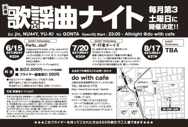 º£Ç¯£µ·î¤«¤éÇßÅÄÅÆ²æÌîÄ®¤Ë¤¢¤ê¤Þ¤¹¡¢do with cafe¤Ë¤ÆËè·îÂ裳ÅÚÍËÆü¡Ö¸µÁÄ¡¡²ÎÍØ¶Ê¥Ê¥¤¥È¡×¤Î³«ºÅ¤¬·èÄêÃפ·¤Þ¤·¤¿¡ª¡ª¡ª ²ñ¾ì¤Îdwc(do with cafe)¤ÏËè·î¡Ö½÷·Ý¿Í¥¥ã¥Ð¥ì¡¼¥Ê¥¤¥È¡×¤ä¡¢nadja¤µ¤ó¤òÂåɽ¤È¤¹¤ë¥É¥é¥Ã¥°¥¯¥¤¡¼¥ó¤Î¥·¥ç¡¼¤Ê¤É³Ú¤·¤á¤ëÁÇŨ¤Ê¤ªÅ¹¤Ç¤¹¡£ ¡Ø¸µÁÄ¡¡²ÎÍØ¶Ê¥Ê¥¤¥È¡Ù ¡ÚÆü»þ¡Û2013ǯ£¶·î£±£µÆü¡Êsat¡Ë¡¡open start 23:00~Allnight ¡Ú¾ì½ê¡Ûdo with cafe Âçºå»ÔË̶èÅÆ²æÌîÄ®£¹¡Ý£²£³¥¸¥å¥é¥¯¥Ó¥ëB1 http://www16.ocn.ne.jp/~dowith/ ¡Ú½Ð±é¡Û DJ : jin, NUSSY, YU-KI DRAG QUEEN SHOWCASE : Perfu...mu? VJ :