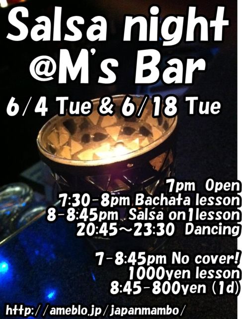 Salsa Night@南柏M's Bar 南柏駅西口すぐのアットホームなバー。6月は第1、第3火曜日! サルサ、メレンゲ、チャチャ、バチャタのリズムに乗って、 飲んで踊って笑って、素敵な夜を過ごしませんか 初めての方でも、Askaのバチャータ&サルサレッスンがありますので 安心して遊びにいらしてくださいね。 【日程】 2013年6月18日(火) 【時間】 19:00 オープン 19:30〜20:00 初級Bachata レッスン 20:00〜20:45 初/中級サルサON1 レッスン 20:45〜23:30 フリーダンスタイム ※レッスンの後