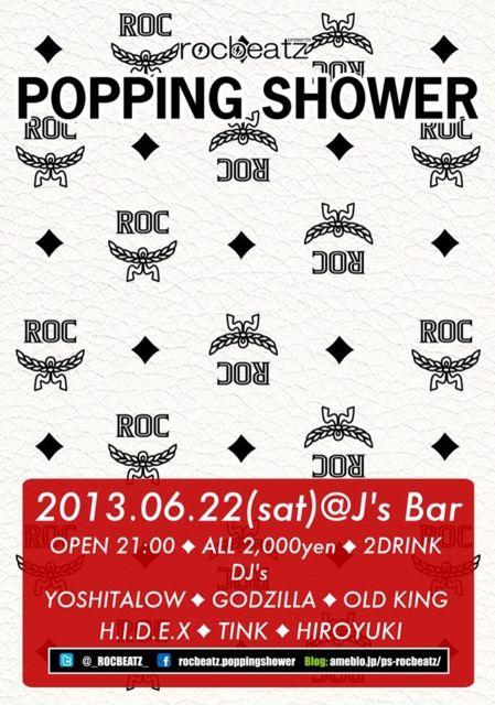 Las Vegas Party Style POPPING SHOWER 6月22日 第4土曜日 @J'sBAR (山形駅前ホテルイーストワン地下) OPEN 21:00〜 Blogやコミュニティー画面提示で 1500円2Dにディスカウント ※提示の無い方は2000円2ドリンク込み ポピシャコミュ http://mixi.jp/view_community.pl?id=2786892& rocbeatzアメブロ http://s.ameblo.jp/ps-rocbeatz/ rocbeatz facebook http://www.facebook.com/#!/rocbeatz.poppingshower DJ YOSHITALOW OLDKING H.I.D.E.X GODZILLA TINK HIROYUKI VJ Hidecii