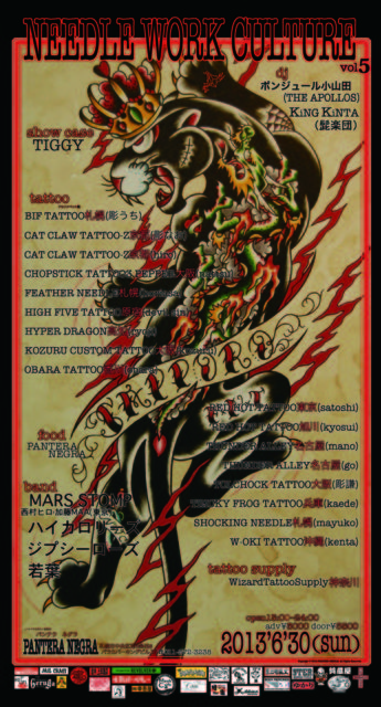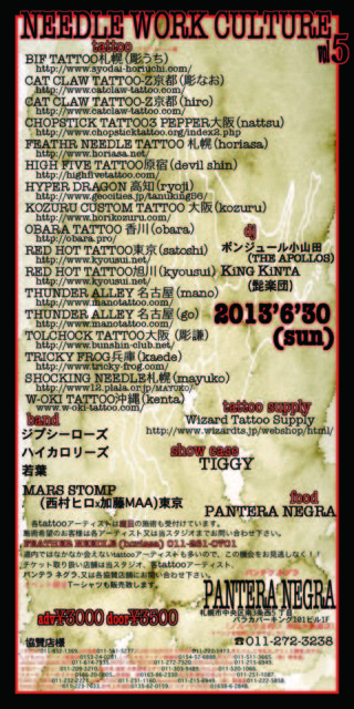 NEEDLE WORK CULTURE vol5 2013'6'30(sun) open15:00~24:00 adv \3000¡¡door\3500 ²ñ¾ì¡¡PANTERA NEGRA ¥Ñ¥ó¥Æ¥é ¥Í¥°¥é »¥ËÚ»ÔÃæ±û¶èÆî£³¾òÀ¾£µÃú¥Ñ¥é¥«¥Ñ¡¼¥¥ó¥°£±£°£±¥Ó¥ë£±F (¥Î¥ë¥Ù¥µË̸þ¤¤¡¡Æî¸þ¤Ï©ÌÌŹ¡Ë ÅÅÏÃ011-272-3238 ³Ætattoo¥¢¡¼¥Æ¥£¥¹¥È¤ÏÅöÆü¤Î»Ü½Ñ¤â¼õ¤±ÉÕ¤±¤Æ¤¤¤Þ¤¹¡£ ¤´Í½Ìó¤Î¤ªµÒÍͤϳÆtattoo¥¢¡¼¥Æ¥£¥¹¥ÈËô¤ÏFEATHER NEEDLE¤Þ¤Ç¤ªÌ䤤¹ç¤ï¤»²¼¤µ¤¤¡£ Æ»Æâ¤Ç¤Ï¤Ê¤«¤Ê¤«²ñ¤¨¤Ê¤¤tattoo¥¢¡¼¥Æ¥£¥¹¥È¤â¿¤¤¤Î¤Ç¡¢¤³¤Îµ¡²ñ¤ò¤ª¸«Æ¨¤·Ìµ¤¯¡ª¡ª ¡üTATTOO¥¢¡¼¥Æ¥£¥¹¥È¡¡¥¢¥ë¥Õ¥¡¥Ù¥Ã¥È½ç BIF TATTOO»¥ËÚ(Ħ¤¦¤Á)http