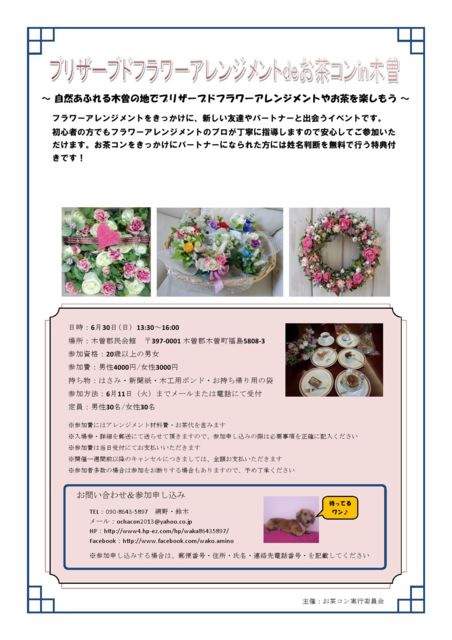 〜 自然あふれる木曽の地でプリザーブドフラワーアレンジメントやお茶を楽しもう 〜 フラワーアレンジメントをきっかけに、新しい友達やパートナーと出会うイベントです。 初心者の方でもフラワーアレンジメントのプロが丁寧に指導しますので安心してご参加いただけます。 お茶コンをきっかけにパートナーになられた方には姓名判断を無料で行う特典付きです! 日時:6月30日(日) 13:30〜16:00 場所:木曽郡民会館 〒397-0001 木曽郡木曽町福島5808-3 参加資格:20歳以上の男女 参加費:男性4000円/女性3000円 持ち