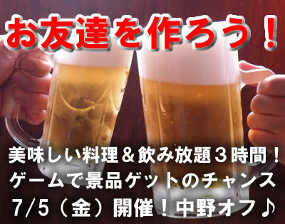 フェイスブックでも募集していまーす https://www.facebook.com/tokyodonuts 「いいね!」してね 梅雨を吹っ飛ばせー 中野でめっちゃ楽しい「中野オフ!」開催しちゃいます 一人での初参加、友達との参加、お酒の飲めない方も大歓迎 すぐに馴染める雰囲気をみんなで作っちゃいます みんなでワイワイ楽しみましょう 「中野に住んでる!」 「中野で働い