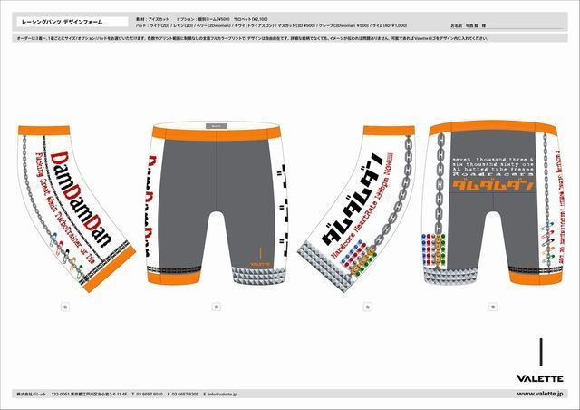 このイベントは「株式会社バレット」で制作した ”ダムダム団”ジャージを 「共同購入」 するためのイベントです。 http://www.valette.jp/item/index.html ■半袖ジャージ http://www.valette.jp/item/item01.html タイト&ワイドフィットやファスナー付きポケットなどオプションOK ■レーシングパンツ(デザイン制作中) http://www.valette.jp/item/item03.html パッド(必ず選択してください)→http://www.valette.jp/item/pad.html 「ビブタイプ」希望の方はオプション(2100円)で”サロペット”指定してくだ