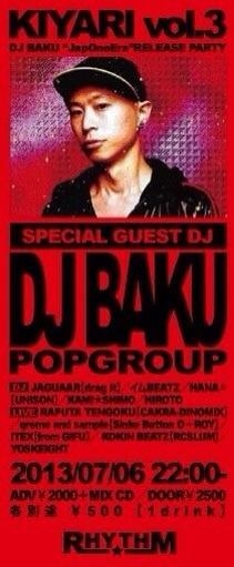 7/6 KIYARI Vol.3/DJ BAKU/JapOneEra Release Party °ËÀª¥ê¥º¥à SP GUEST DJ BAKU DJs JAGUAAR ¥¤¥àBEATZ HANA¡ö KAMI¡ùSHIMO HIROTO LIVE KOKIN BEATZ RAPUTA TENGOKU qreme and sample YOSKEIGHT ITEX http://rhythmtimes.com