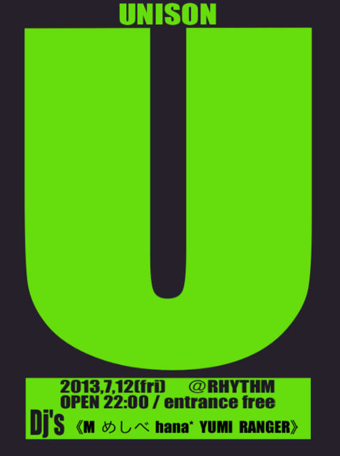 7/12(fri) unison¡¡Dance music.Feel It. @°ËÀªRHYTHM 22:00- entrance free (1d ¡ï500) DJ's ¤á¤·¤Ù/hana*/M/yumi http://rhythmtimes.com
