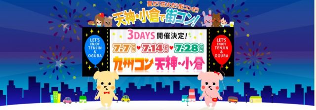 今週末に小倉で街コンを予定しています。 男性は完売!女性も残りわずかです。是非ご参加ください♪ 【日時】7月14(日)14:00〜17:00(受付は13:00〜) 【参加費/1名あたり】男性:5,900円 女性:4,000円(2名1組で申込) 【場所】小倉駅徒歩3分 【公式HP】http://kyushucon.info/ 【過去の開催報告】http://kyushucon.info/news/1955 お申込みは公式HPからお願いします。 気になった方は、メッセージいただければご案内させていただきます。 よろしくお願いいたします。