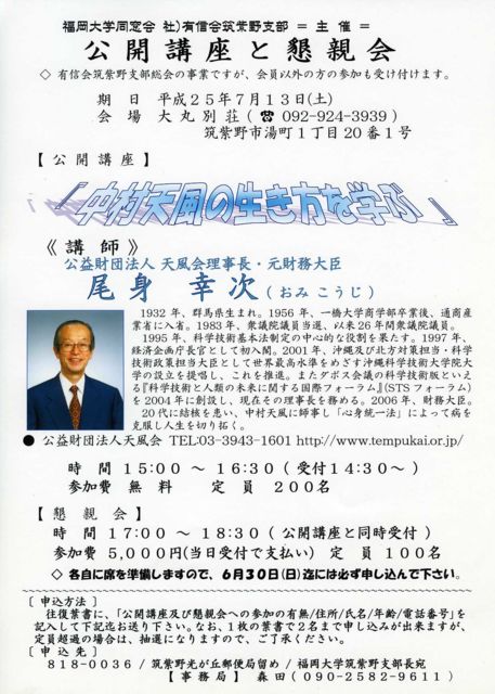 ◇ 有信会筑紫野支部総会の事業ですが、会員以外の方の参加も受け付けます。 ◇ 福岡大学卒業で筑紫野市在住の方には、別に総会開催のご案内を差し上げて おりますが、住所がわからずにお送りできなかった方もいらっしゃいます。 ご案内が届いていなかった方は、下記の事務局までご連絡ください。 《 期 日 》7月13日(第二土曜日) 受付 12時30分 《 会 場 》大 丸 別 荘 ( 092-924-3939 ) 筑紫野市湯町1丁目20番1号 【 公 開 講 座 】 『中村天風の生き方を学ぶ』 〔 講 師 〕公