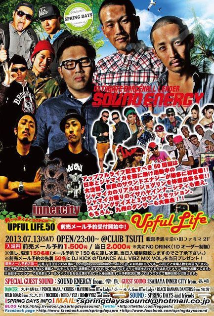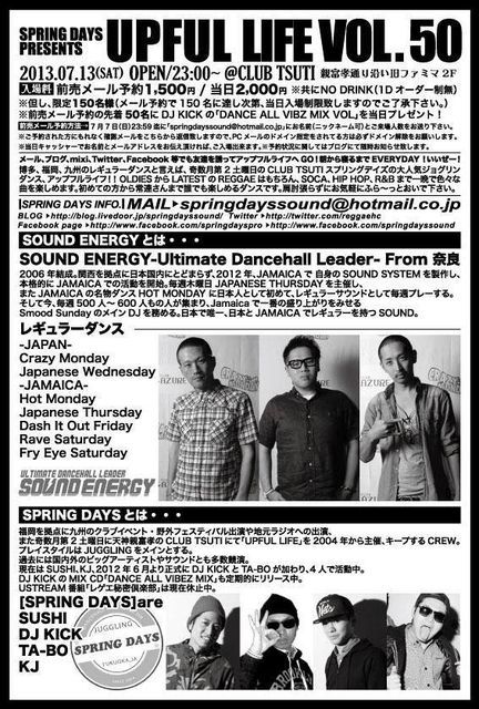 SPRING DAYS presents 「UPFUL LIFE VOL.50」 2013年7月13日(土)23:00〜 @CLUB TSUTI(親富孝通り沿い旧ファミマ2F) 入場料:前売メール予約1500円/当日2000円 ※共にNO DRINK(1Dオーダー制無) ※但し、限定150名様(メール予約で150名に達し次第、当日入場制限致しますのでご了承下さい。) ※前売メール予約の先着50名にDJ KICKの「DANCE ALL VIBZ MIX」を当日プレゼント! 前売メール予約受付開始中! 前売メール予約方法→ 7月7日(日)23:59迄に 「springdayssound@hotmail.co.jp」 にお名前(ニックネーム可