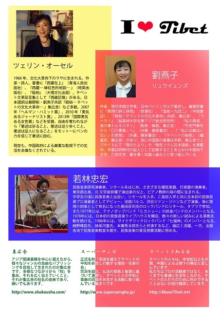 大阪在住の中国人文学者、劉 燕子さんの講演会です。 劉さんは、北京在住のチベット人女性作家ツェリン・オーセルさんの 親しい友人で、オーセルさんの著作「殺劫 ーチベットの文化大革命ー」 や「チベットの秘密」の翻訳者でもあります。 なお、オーセルさんは、つい最近中国政府により再度自宅軟禁下に 置かれています。 今回のイベントは、北京に住み中国政府の厳重な監視下に置かれている チベット人の思いを、日本に住む中国の人が代わりに語るという興味深い シチュエーションだと思います。 当日は、世界中のほとん