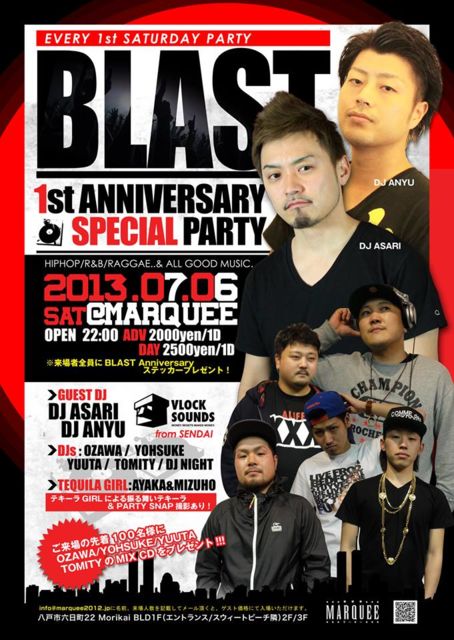 ■■■■■■■■■■■■■■■■■■■■■■■■■■■■■■■■■ 毎月第1土曜日開催のレギュラーパーティー【BLAST 】は、7月をもってめでたく1周年! 記念すべき今回は、仙台VLOCK SOUNDSより、 DJ ASARI & DJ ANYU!両氏を迎え、更に熱く、盛大に盛り上げます!! 圧倒的なミックスセンスとスキルで、東北は基より、 全国各地にその活動の場を拡げている彼らのプレイは 、全てのパーティーフリークを魅了する事間違いナシ ! スタッフ一同、皆さまのお越しをお待ちしております !! ■VLOCK SOUNDS OFFICIAL WEBSITE http: