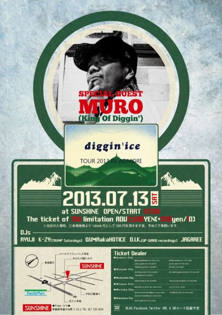 『DIGGIN' ICE TOUR 2013 in AOMORI』 2013.7.13(sat) @AOMORI SUNSHINE OPEN-START 21:00 ADV 2,500yen(+500yen/1drink) The Ticket of 150 Limitation 【Special Guest DJ】 MURO(King Of Diggin') 【DJ】 D.I.K.(UP-WARD Recordings) JAGAREE K-ZY(TRUMP Saturdays) QUMAakaHOTICE RYUJI YUTER(FREAK) TICKET DEALER決定しました。 販売開始日のお知らせは、追ってお知らせします。 《青森市》 BEAM ANTENNA 017-723-1772 BITTER DARTS 017-775-7069 CHILL MART 017-776-8770 CREAMY PRISON 017-776-1133 MOVE O