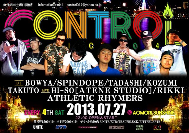 CONTROL Vol.102 2013/07/27(SAT) 22:00 START at 青森SUNSHINE (http://aomorisunshine.web.fc2.com/sunshine/index.html ) 前売り ¥1500/1D 当日 ¥2000/1D LIVE!! HI-SO(ATENESTUDIO) ATHRETIC RHYMERS RIKKI and more... DJ!! BOWYA TADASHI KOZUMI TAKUTO SPINDOPE INFO!! MAIL control017@yahoo.co.jp BLOG http://ameblo.jp/control017/