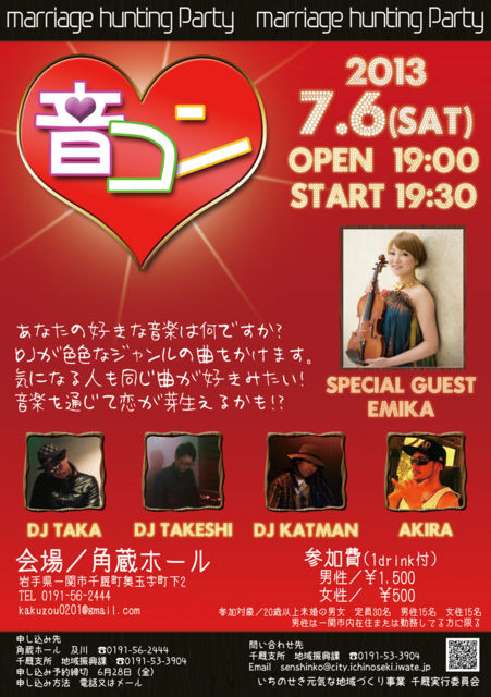 ¡ÖÎø¤Î»Ï¤Þ¤ê¤Ï²»³Ú¤¬¤¤Ã¤«¤±¡× ¤¢¤Ê¤¿¤Î¹¥¤¤Ê²»³Ú¤Ï²¿¤Ç¤¹¤«¡© DJ¤¬¿§¡¹¤Ê¥¸¥ã¥ó¥ë¤Î¶Ê¤ò¤«¤±¤Þ¤¹¡£ µ¤¤Ë¤Ê¤ë¿Í¤âƱ¤¸¶Ê¤¬¹¥¤¤ß¤¿¤¤¡ª ²»³Ú¤òÄ̤¸¤ÆÎø¤¬²êÀ¸¤¨¤ë¤«¤â¡ª¡© ³«ºÅÆü¡¿2013ǯ7·î6Æü¡ÊÅÚ¡Ë OPEN¡¿19¡§00 START¡¿19¡§30 »²²ÃÈñ¡Ê1drinkÉÕ¡Ë ÃËÀ¡¿1500±ß ½÷À¡¿500±ß »²²ÃÂоݡ¿20ºÐ°Ê¾å̤º§¤ÎÃ˽÷ Äê°÷30̾¡¡ÃËÀ15̾¡¡½÷À15̾ ¢¨ÃËÀ¤Ï°ì´Ø»ÔÆâºß½»¤Þ¤¿¤Ï¶Ð̳¤·¤Æ¤ëÊý¤Ë¸Â¤ë Special Guest¡¿¥ô¥¡¥¤¥ª¥ê¥ó¥·¥ó¥¬¡¼³¨Èþ²Æ DJ TAKA[NITE CRUISING] DJ TAKESHI[NITE CRUISING] D