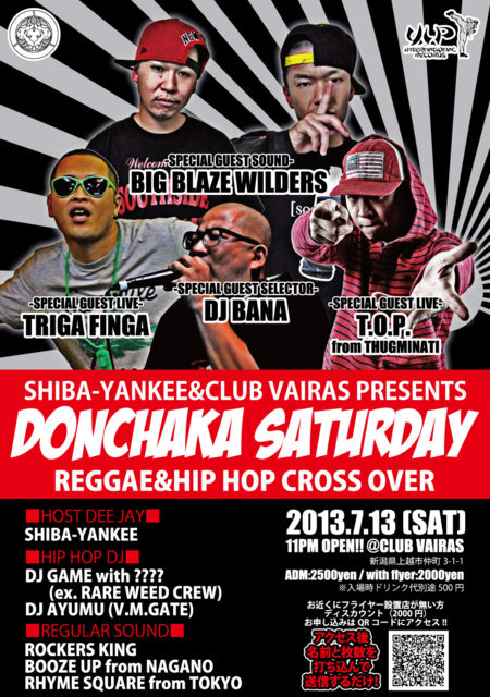 2013.7.13(SAT) ¡ÚDONCHAKA SATURDAY¡Û -REGGAE&HIP HOP CROSS OVER- 23:00 OPEN!! @CLUB VAIRAS ¿·³ã¸©¾å±Û»ÔÃçÄ®3-1-1 Admission¡¡2500±ß with flyer¡¡2000±ß ¢¨Æþ¾ì»þ¥É¥ê¥ó¥¯ÂåÊÌÅÓ500±ß ¢¨¤ª¶á¤¯¤Ë¥Õ¥é¥¤¥ä¡¼ÀßÃÖŹ¤¬Ìµ¤¯¥Ç¥£¥¹¥«¥¦¥ó¥È¸æ´õ˾¤ÎÊý¤Ï clubvairas@gmail.com¤Þ¤¿¤Ï¡¢³Æ½Ð±é¼Ô¤Ë¤ªÌ¾Á°¤È¿Í¿ô¤òÏ¢Íí²¼¤µ¤¤¡£ 2000±ß¤Ç¸æÆþ¾ì失¤Þ¤¹¡£ SHIBA-YANKEE -SPECIAL GUEST LIVE- T.O.P. from THUGMINATI TRIGA FINGA -SPECIAL GUEST SELECTOR&SOUND- DJ BANA BIG BLAZE WILDERS