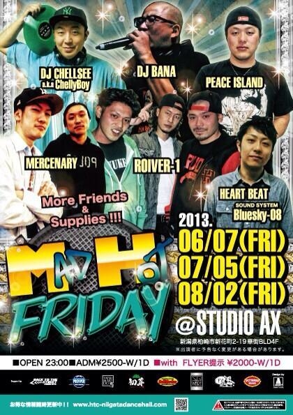 MAD HOT FRIDAY -NEW STANDARD OF NIIGATA DANCEHALL- 2013/7/5(FRI) @STUDIO AX ¿·³ã¸©Çðºê»Ô¿·²ÖÄ®2-19²Ú³¹BLD4F OPEN:23:00¡Á WITH FLYER ¡ï2000-W/1D ADM ¡ï2500-W/1D GUEST DJ DJ CHELSEE a.k.a ChellyBoy SOUND DJ BANA ROIVER-1 PEACE ISLAND MERCENARY HEART BEAT more friends & surprise!! SOUND SYSTEM BLUESKY-08 INFO www.htc-niigatadancehall.com twitter ¥¢¥«¥¦¥ó¥È¡§@MADHOTFRIDAY1 ¥Ï¥Ã¥·¥å¥¿¥°¡§#MADHOTFRIDAY Ëè·îÂè°ì¶âÍËÆü¤Ë¿·³ã¸©Çðºê»ÔSTUDIO AX¤Ë¤Æ³«ºÅ¤·¤Æ