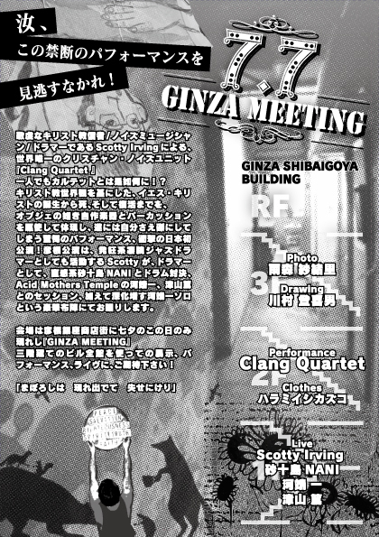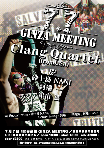 AMT¥Ä¥¢¡¼¤Ë¤ÆÀ仿¤òÇ¤¿Clang Quartet¤¬½éÍèÆü¡ª ²Ïü°ì¤ÎÁ´ÌÌ¥µ¥Ý¡¼¥È¤ò¼õ¤±¤Æ¤ÎJapan tour ¡¢ ²Ïü°ì¡¢ÄÅ»³ÆÆ»²²Ã¤Îɧº¬ÊÔ¡ª¡ªº½½½ÅçNANI¤È¤Î¥É¥é¥àÂзè¤â¡ª¡ª¡ª Clang Quartet Japan tour 2013¡¡¡÷ɧº¬ GINZA MEETING 7·î7Æü¡ÊÆü¡Ë¡÷ɧº¬ GINZA MEETNG (¼¢²ì¸©É§º¬»Ô¶äºÂÄ®4¡Ý26 ¶äºÂ¼Çµï¾®²°¥Ó¥ë) w/ Scotty Irving + º½½½ÅçNANI, Scotty Irving + ²Ïü°ì + ÄÅ»³ÆÆ, ²Ïü°ìsolo open 18:00 / start 18:30 adv \2000 / door \2300 ¢¨Æó¡¦»°³¬Å¸¼¨¤Ï¡¢7/1¡Á7/7¤Þ¤Ç¡¢ÅöÆü¤Ï12»þ¤è¤ê¤´Í÷¤Ë¤Ê¤ì¤Þ¤¹¡£ Ì䤤¹ç¤ï¤»¡§bo-cyan@ho