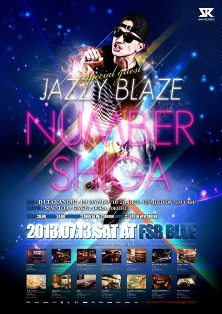 ¹ðÃμºÎ餤¤¿¤·¤Þ¤¹m(__)m Á°²ó¤Î7¼þǯ¤òÂçÀ¹¶·¤ÎËö¤Ë½ª¤¨8ǯÌÜ¤ËÆÍÆþ¤·¤¿NUMBER SHIGA¡ª¡ª º£²ó¤Ï¿·¤¿¤ÊÌç½Ð¤ËÁê±þ¤·¤¤GUEST¤ËÃϸµ¼¢²ì¤òÂåɽ¤¹¤ëRAPPER MAR»á¤ÎºÇ¿·¶ÊMr.MUSICIAN¤ËFeat¤Ç»²²Ã¤·¤¿»ö¤Ç¤âµ²±¤Ë¿·¤·¤¤REP¿À¸Í JAZZY BLAZE»á¤¬µ×¤·¤Ö¤ê¤ËNUMBER SHIGA¤ËÅо졪¡ª ¤½¤·¤ÆÀèÃåÆÃŵ¤È¤·¤Æ 50̾ÍͤËDJ 2G-RICE¤Ë¤è¤ëMIXCD ¤ò¥×¥ì¥¼¥ó¥È ¤¼¤ÒÁá¤á¤Î¤´Íè¾ì¤ò¤ªÂÔ¤Á¤·¤Æ¤ª¤ê¤Þ¤¹¡ª¡ª °Ê²¼¾ÜºÙ¢ NUMBER SHIGA ¢£DATE¢£ 2013.7.13 SATURDAY OPEN 20:00 ¡Á DOWN 24:00 ¢£CAST¢£ -SPECIAL GUEST LIVE- JAZZY
