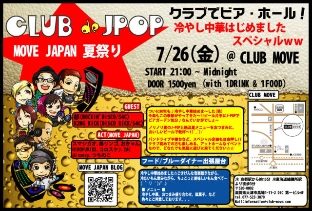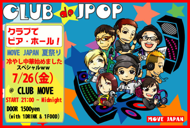 ¥¤¥Ù¥ó¥È¤Î¤ªÃΤ餻¤Ç¤¹¡£¤Á¤ç¤Ã¤È¥¿¥¤¥È¥ëŤ¤¤Ç¤¹¤¬£÷£÷£÷ ¡Ö CLUB de JPOP / MOVE JAPAN ²Æº×¤ê¥¯¥é¥Ö¤Ç¥Ó¥¢¡¦¥Û¡¼¥ë¡ª ... Îä¤ä¤·Ãæ²Ú¤Ï¤¸¤á¤Þ¤·¤¿ ¥¹¥Ú¥·¥ã¥ë£÷£÷¡× ¤Ç¤¹£÷£÷ 7/26(¶â) CLUB MOVE (¼¢²ì¸© Á·½ê) START 21:00 ~ Midnight DOOR 1500yen (with 1DRINK & 1FOOD) 1500±ß¤Ç1¥É¥ê¥ó¥¯¡¢1¥Õ¡¼¥ÉÉÕ¤¤¤Æ¤Þ¤¹¡£ ÆâÍÆ¤Ç¤¹¡£ ¤Ä¤¤¤ËMOVE¤â¢öÎä¤ä¤·Ãæ²Ú»Ï¤á¤Þ¡Á¤·¤¿(¾Ð) º£Ç¯¤â¤³¤Îµ¨À᤬¤ä¤Ã¤Æ¤¤¿¡Á!!¥Ó¡¼¥ëÊÒ¼ê¤ËJ-POP¤Ç¥Ó¥¢¥¬¡¼¥Ç¥óµ¤Ê¬¢ö¤Ê¤ó¤Æ¤¤¤«¤¬¤Ç¤·¤ç¡¼ ¥Ð¥ó¥É¥é¥¤¥Ö¤ä²°Âæ¤Ê¤É¡¢¥¹¥Ú¥·¥ã¥ë´ë²è¤âÌÜÇò