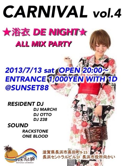 ¹ðÃμºÎ餷¤Þ¤¹¡£ ALL MIX PARTY <CARNIVAL vol.4> Íá°á DE NIGHT Open 20:00¡Ámidnight Entrance \1000(with 1drink) DJ DJ MARCH DJ OTTO DJ 238 SOUND RACKSTONE ONE BLOOD ¡ö¹ðÃΡö ¤ä¤Ã¤Æ¤Þ¤¤¤ê¤Þ¤·¤¿¡¢²Æ¡ª¡ª ²Æ¤È¤¤¤¨¤ÐÍá°á¡ª Íá°á¤È¤¤¤¨¤ÐĹÉÍÍá°á¤Þ¤Ä¤ê¡ª ¤½¤¦¡ªÄ¹ÉͤÎÍá°á¤Þ¤Ä¤ê¤ËÊ»¤»¤Æ³«ºÅ¤·¤Þ¤¹CARNIVAL¡ù º£²ó¤ÏSpecial party Íá°á DE NIGHT¡ª¡ª ʹ¤¤¤¿¤À¤±¤Ç³Ú¤·¤½¤¦¤Ç¤·¤ç¡© ³Ú¤·¤ó¤¸¤ã¤¤¤Þ¤·¤ç^ ^ ĹÉÍÍá°á¤Þ¤Ä¤ê¤Î²ñ¾ì¤Ë¶á¤¤SunSet 88¤À¤«¤é»×¤¤ÀڤäƤǤ¤ë¥¤¥Ù¥ó¥È¤Ç¤¹¡ª¡ª ±Ø