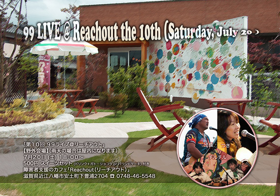 ¥Õ¥é¥¤¥ä¤Î³ÈÂç ¢ª http://99live.jp/history/reachout_10_l.jpg ¡ù99 LIVE @ Reachout the 10th (Saturday, July 20 ) ¡ÖÂ裱£°²ó £¹£¹¥é¥¤¥Ö¡÷¥ê¡¼¥Á¥¢¥¦¥È¡×¡ÚÌî³°²ñ¾ì¡Û¡Ê±«Å·¤Î¾ì¹ç¤Ï²°Æâ¤Ë¤Ê¤ê¤Þ¤¹¡Ë [date] £··î£²£°Æü (ÅÚ) [start] £±£¸¡§£°£°¡Á¡Ê¡ù¸á¸å£¶»þ¥¹¥¿¡¼¥È¤Ç¤¹¡Ë [place] ¾ã³²¼Ô»Ù±ç¤Î¥«¥Õ¥§¡ÖReachout¡Ê¥ê¡¼¥Á¥¢¥¦¥È¡Ë¡× [charge] 500±ß ¥¹¥¤¡¼¥Ä¥»¥Ã¥È(¥É¥ê¥ó¥¯¡Ü¥¬¥È¡¼¥·¥ç¥³¥é or ¥Ñ¥¦¥ó¥É¥±¡¼¥) ÉÕ¤ [act] ¤Ä¤¡¤ÃÄĹ¡¤¥Á¥ë¥Á¥ë Google¥Þ¥Ã¥× ¢ª http://goo.gl/maps/fVQ8c ¾ÜºÙ¤Ï ¢ª http://99live.jp ·ÈÂÓ¡¦