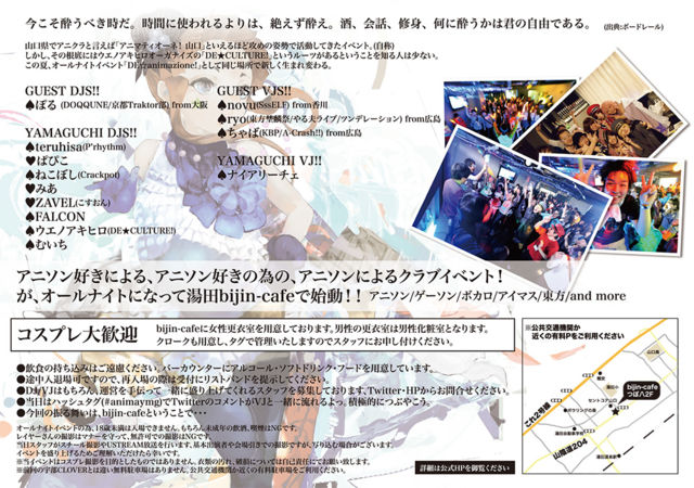 º£¤³¤½¿ì¤¦¤Ù¤»þ¤À¡£»þ´Ö¤Ë»È¤ï¤ì¤ë¤è¤ê¤Ï¡¢À䤨¤º¿ì¤¨¡£¼ò¡¢²ñÏᢽ¤¿È¡¢²¿¤Ë¿ì¤¦¤«¤Ï·¯¤Î¼«Í³¤Ç¤¢¤ë¡£(½Ðŵ:¥Ü¡¼¥É¥ì¡¼¥ë) »³¸ý¸©¤Ç¥¢¥Ë¥¯¥é¤È¸À¤¨¤Ð¡Ö¥¢¥Ë¥Þ¥Æ¥£¥ª¡¼¥Í! »³¸ý¡×¤È¤¤¤¨¤ë¤Û¤É¹¶¤á¤Î»ÑÀª¤Ç³èư¤·¤Æ¤¤¿¥¤¥Ù¥ó¥È¡£(¼«¾Î) ¤·¤«¤·¡¢¤½¤Îº¬Äì¤Ë¤Ï¥¦¥¨¥Î¥¢¥¥Ò¥í¥ª¡¼¥¬¥Ê¥¤¥º¤Î¡ÖDE¡úCULTURE!¡×¤È¤¤¤¦¥ë¡¼¥Ä¤¬¤¢¤ë¤³¤È¤òÃΤë¿Í¤Ï¾¯¤Ê¤¤¡£ ¤³¤Î²Æ¡¢¥ª¡¼¥ë¥Ê¥¤¥È¥¤¥Ù¥ó¥È¡ÖDE¡ùanimazione!¡×¤È¤·¤ÆÆ±¤¸¾ì½ê¤Ç¿·¤·¤¯À¸¤Þ¤ìÊѤï¤ë¡£ GUEST DJS! ¡ü¤Ý¤ë(DOQQUNE/µþÅÔTraktorÉô)fromÂçºå YAMAGUCHI DJS! ¡üteruhisa(P'rhythm
